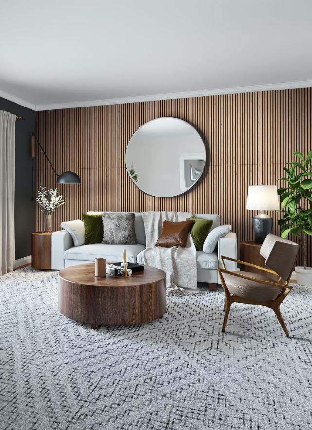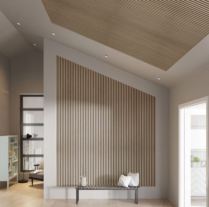 Panoul acustic – riflaj din lemn – poate fi folosit pentru a crea un perete elegant din lamele sau tavan din lamele în casa ta.