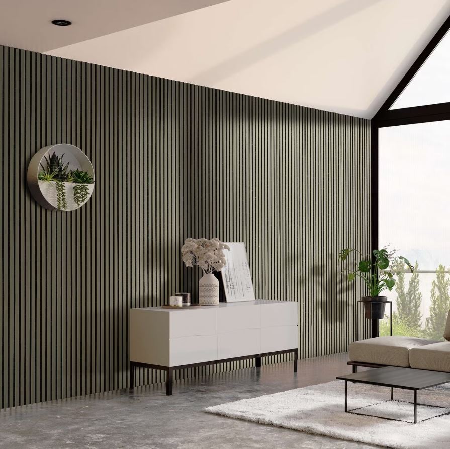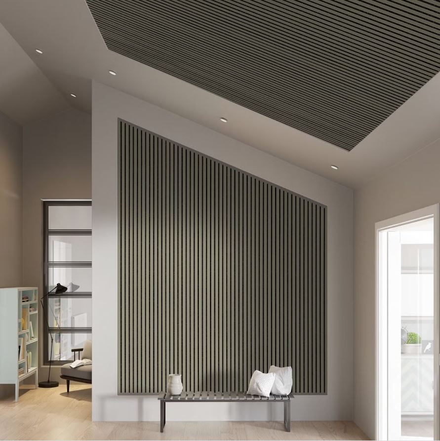 Panoul acustic – riflaj din lemn – poate fi folosit pentru a crea un perete elegant din lamele sau tavan din lamele în casa ta.
