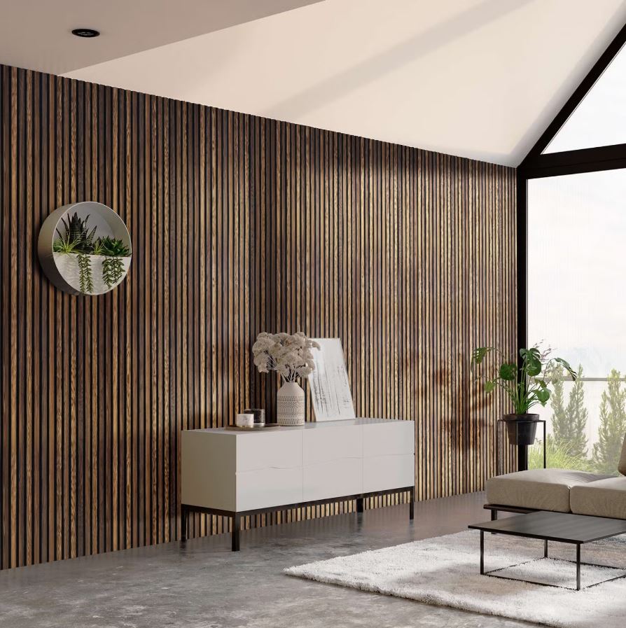 Panoul acustic – riflaj din lemn – poate fi folosit pentru a crea un perete elegant din lamele sau tavan din lamele în casa ta.