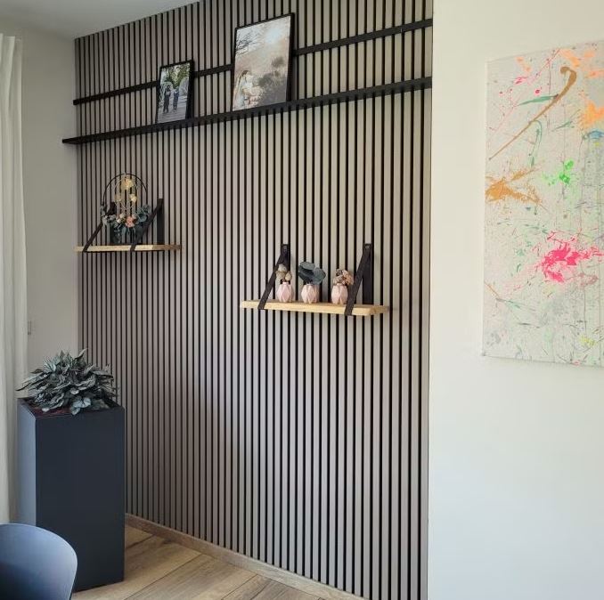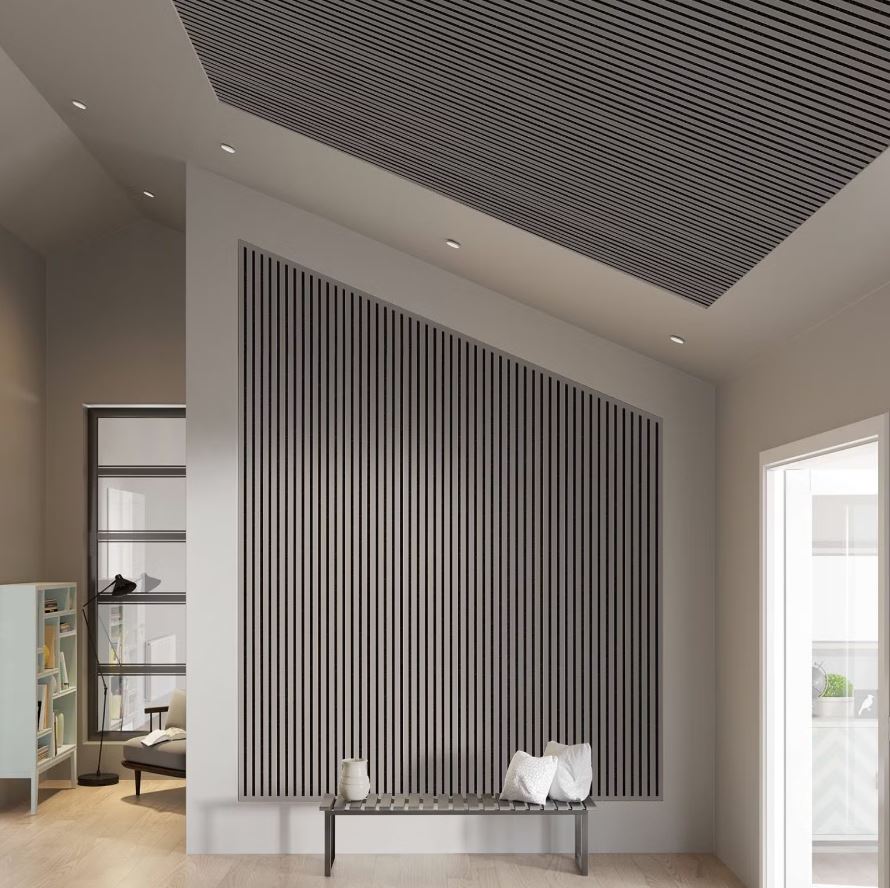 Panoul acustic – riflaj din lemn – poate fi folosit pentru a crea un perete elegant din lamele sau tavan din lamele în casa ta.