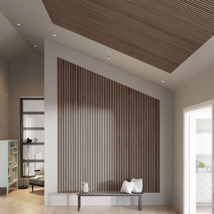 Panoul acustic – riflaj din lemn – poate fi folosit pentru a crea un perete elegant din lamele sau tavan din lamele în casa ta.