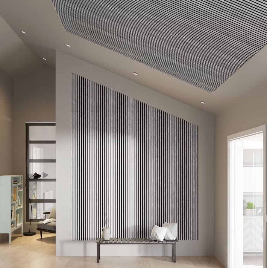 - ATENUEAZĂ SUNETUL CU UN PANOU REALIZAT DIN LAMELE BINE PROIECTATE, CARE ABSOARBE SUNETUL ŞI ÎNLĂTURĂ REVERBERAŢIILE.